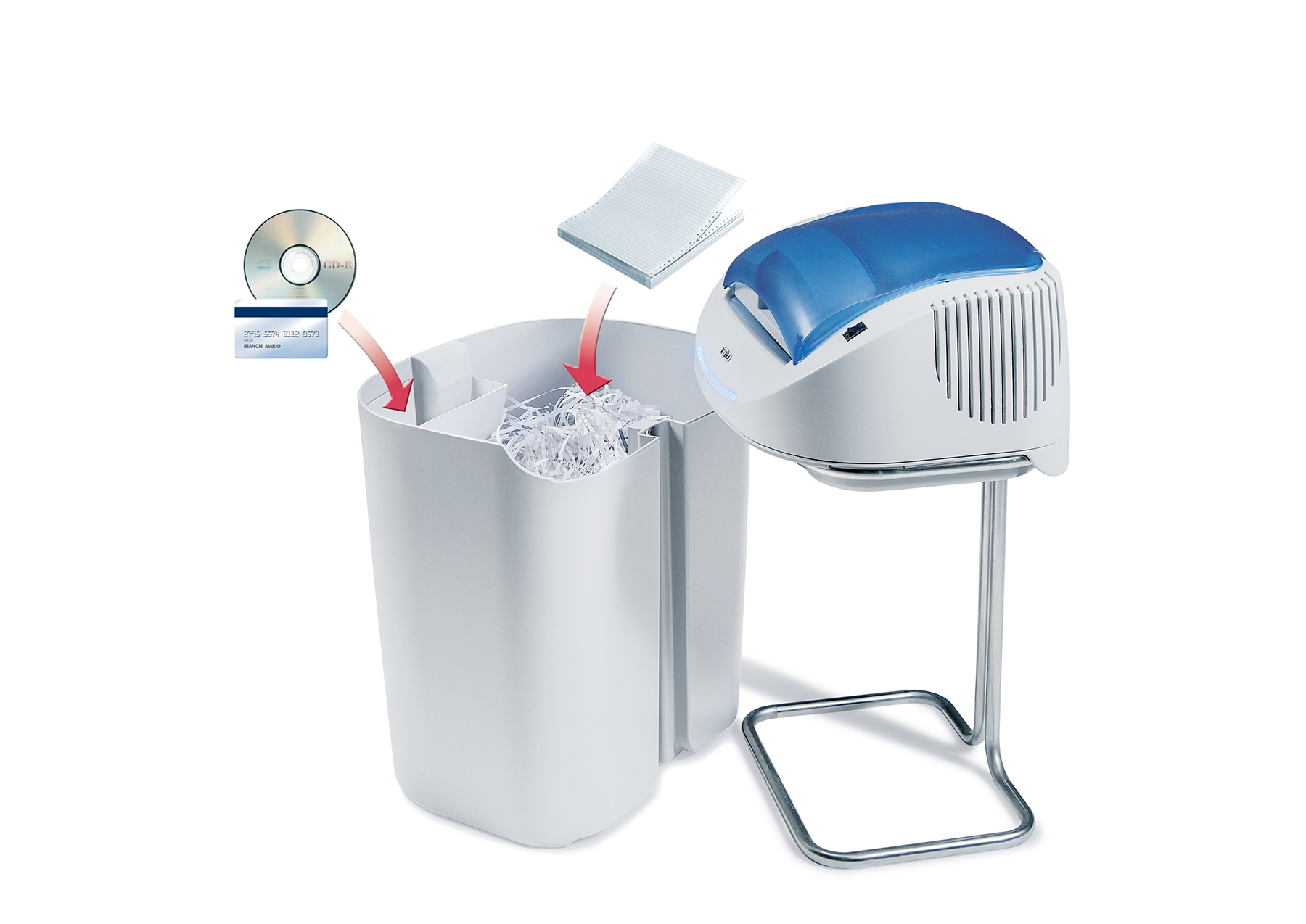 Personal and deskside shredder with transparent opening lid and automatic suspension closing. It can shred up to 8 sheets at a time in 1,9 x 15 mm (P-5) cross cut by just inserting them into the throat on the front. Shreds CDs, DVD and credit cards by inserting them into the second throat. Motor thermal protection: 24 hour continuous duty motor without overheating and duty cycle. Carbon hardened cutting knives unaffected by staples and clips.