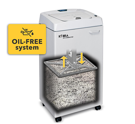 Kobra AF.2 Auto-feed/Auto-compact shredder is the most innovative and fastest automatic shredder available in the global market: the special paper Compacting System optimizes bag capacity and avoids frequent emptyings, increasing by 4 times - from 150 to 600 liters - the size of the cabinet. The shredding speed allows walk-away fast shredding of documents. Kobra AF.2 features a large paper tray for up to 400 sheets and a separate entry for manual feed shredding of documents, credit cards, films, CD/DVD.
