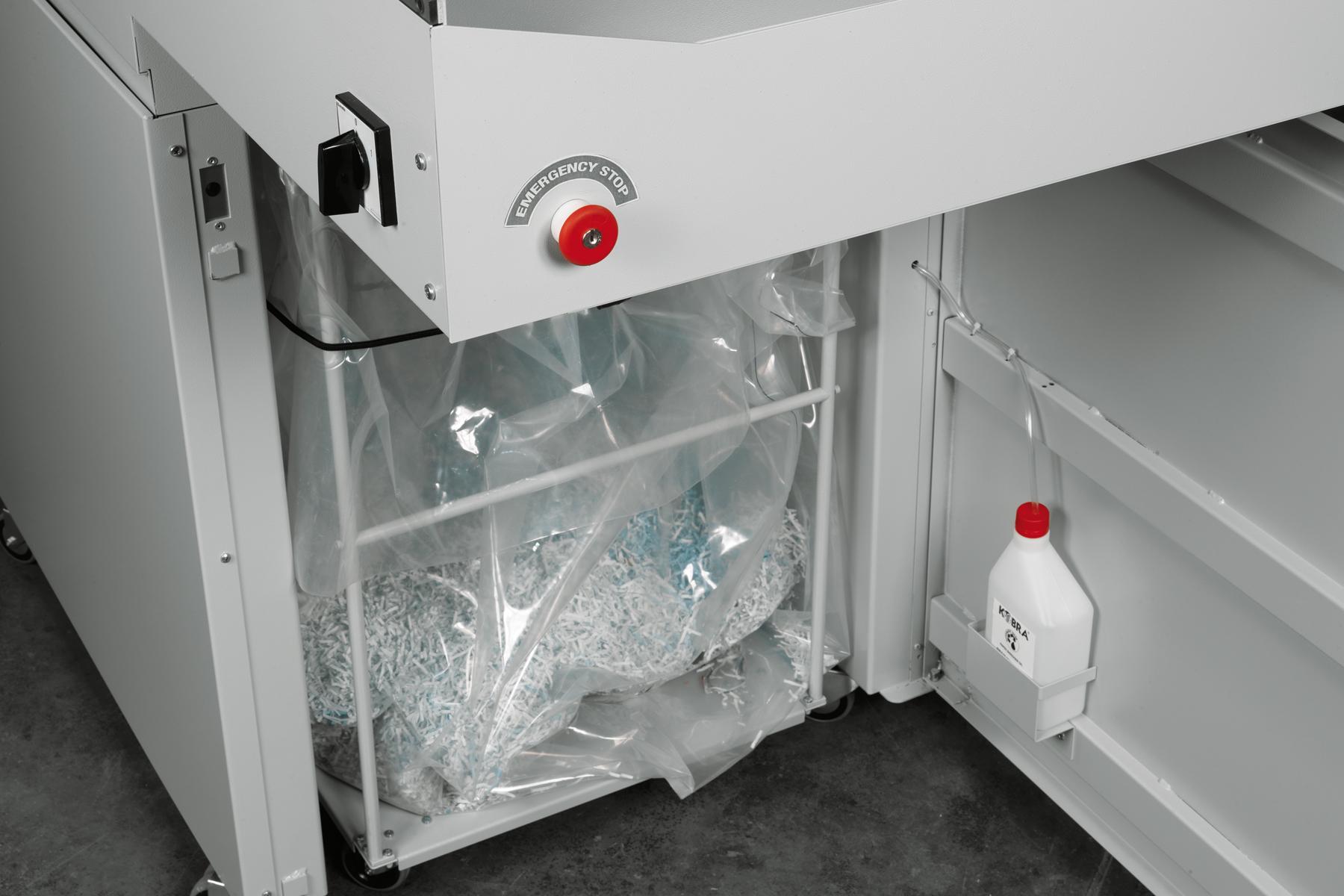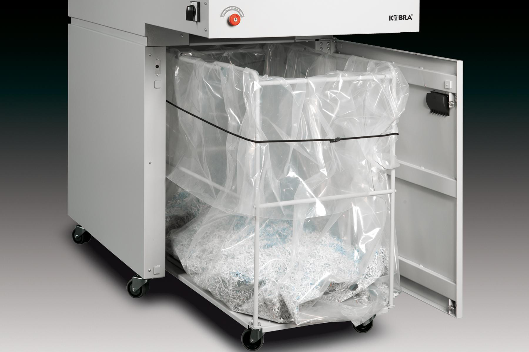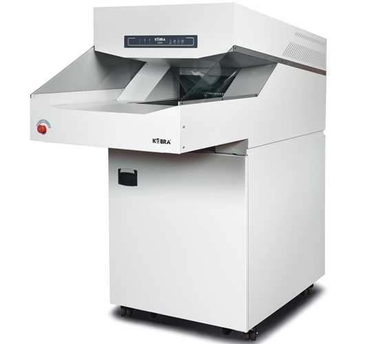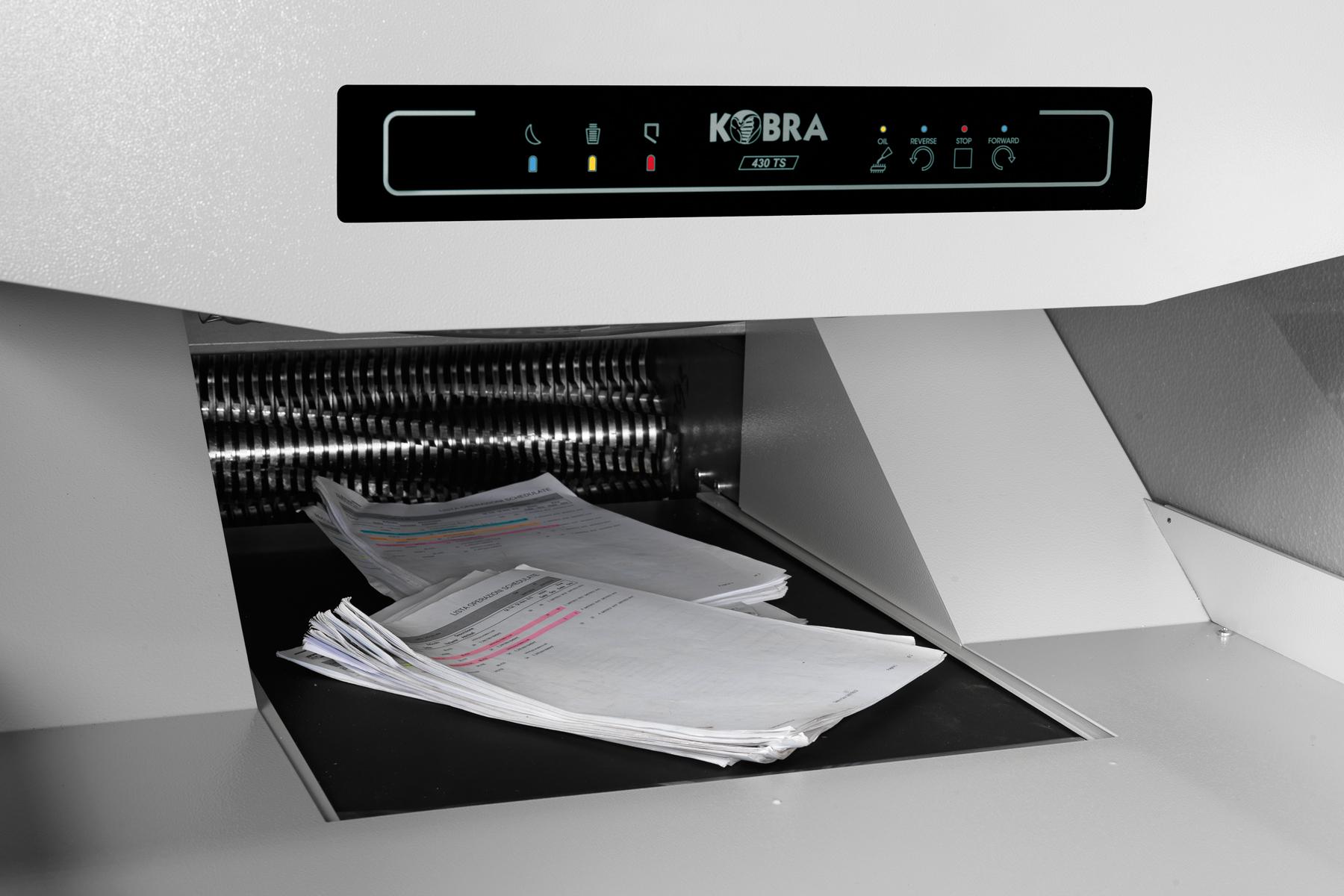 High performance conveyor belt industrial shredder. Designed for large shredding throughput and continuous shredding operations. Convenient conveyor belt for easy feeding of material to shred: can shred up to 130 sheets of paper at a time, Kobra 430 TS shreds also CDs, DVDs, Credit cards, floppy-disks, in 5,8 mm x 50 mm (P-3) cross cut. Equipped with "Super Potential Power Unit": heavy duty chain drive system with steel gears. Carbon hardened steel cutting knives, unaffected by staples and metal clips. Motor thermal protection. 24 hours continuous duty motor: no duty cycle or timed cool down period. Kobra 430 TS comes with an integrated automatic oiling system that ensures maximum efficiency. Automatic stop with light signal for waste container full or cabinet door open. Removable and sturdy 470 litres waste container mounted on casters, two arrangements available: two 235-litre plastic waste bags or one 470-litre bag.
