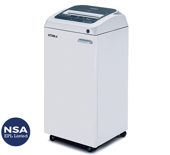 Professional high security touch screen shredder suitable to shred "Classified" and "Top Secret" documents: all controls are activated by simply touching the panel. Motor thermal protection: 24 hour continuous duty motor without overheating and duty cycle, carbon hardened steel cutting knives. Kobra 260 TS HS-6 can shred a paper sheet in about 20.000 0,8 x 5 mm mm (P-7) micro-chips which become absolutely unreadable even if special electronic devices are used. The 0,8 x 5 mm mm cut size exceeds the NSA/CSS Spec. 02-01 National Security Agency requirements. It can shred transparent material too. Heavy duty chain drive with steel gears which offer reliability and resistance to wear.
