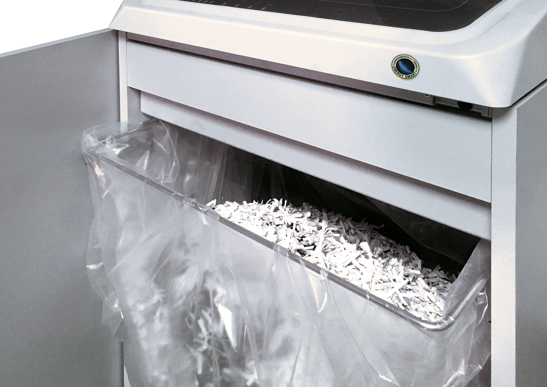 Equipped with: Motion sensor (new option) and Energy Smart System with automatic disconnection from the mains for maximum power saving, Integrated Automatic Oiling System, EPC (Electronic Power Control) to optimize shredding without jams, Automatic Start&Stop, Safety Stop at door opening and/or full waste bag, Automatic Reverse in case of jamming. 150 litre high volume cabinet mounted on casters.