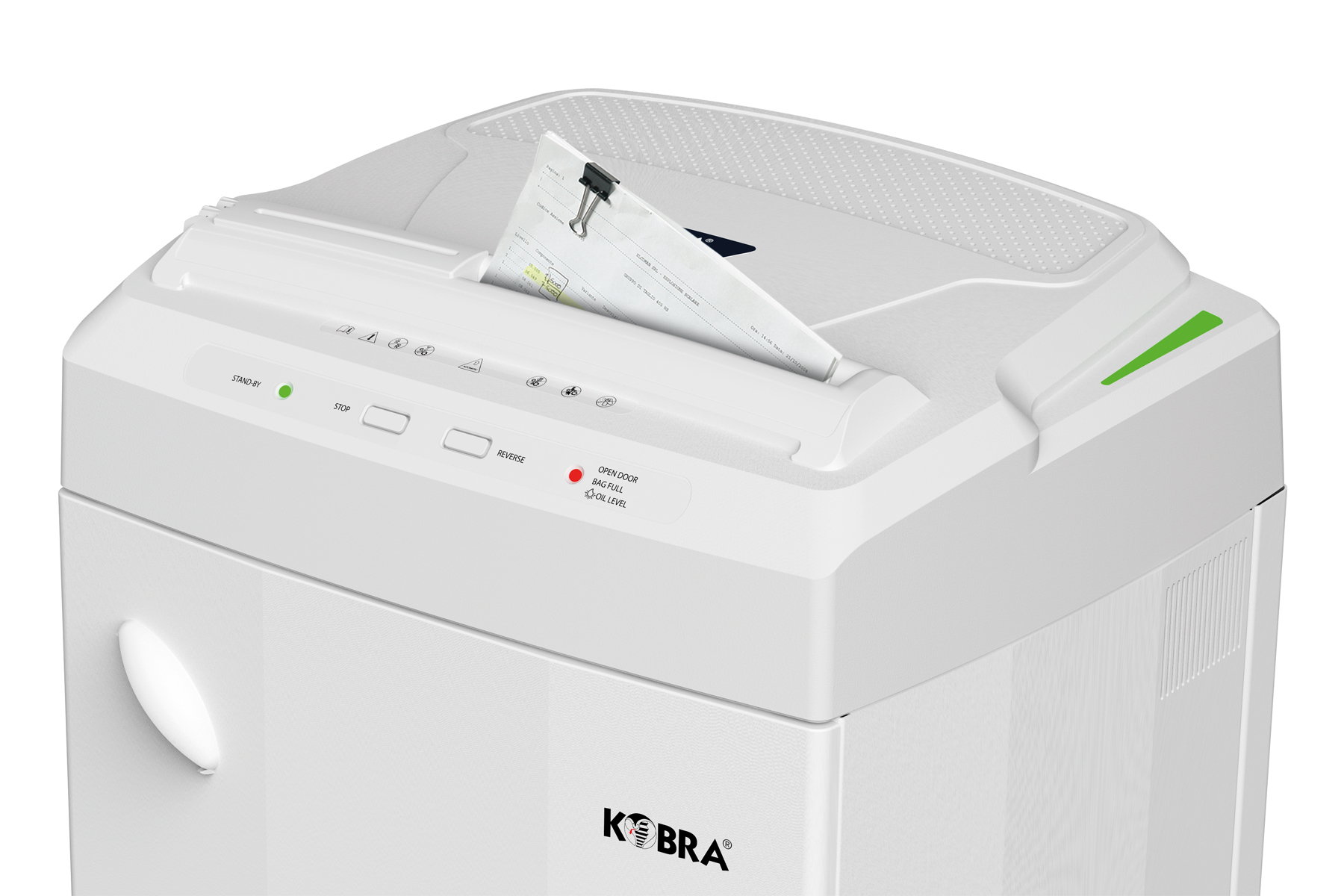 Designed to shred large quantities of paper, credit cards, CD/DVD and Floppy-disks, Kobra 400 C4 shreds up to 48 sheets at a time in 3/16 x 1 1/2 inch (P-4) cross cut. Motor thermal protection: 24 hour continuous duty powerful 2.9 HP motor without overheating and duty cycle. Carbon hardened steel cutting knives unaffected by staples and metal clips and heavy duty chain drive with steel gears which offer reliability and resistance to wear.