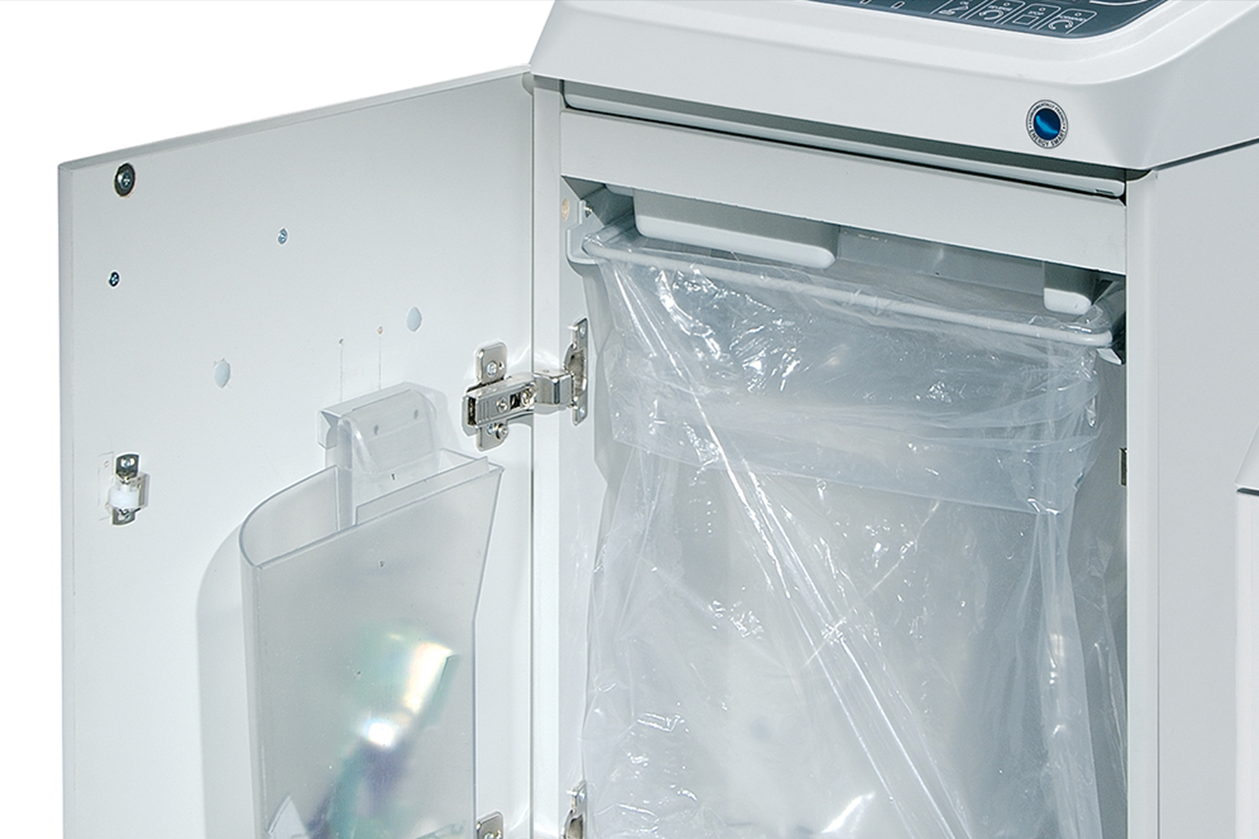 Two separate set of cutting knives: one for paper and one for CDs/DVDs/credit cards. Two distinct integrated removable bins to separate shredded paper from plastic shreds. It can shred transparent material too. Equipped with: Energy Smart System and automatic disconnection from the mains for maximum power saving, Automatic Start&Stop, Safety Stop at door opening and/or full waste bag, Automatic Reverse in case of jamming. Convenient 22 gallon cabinet mounted on casters.