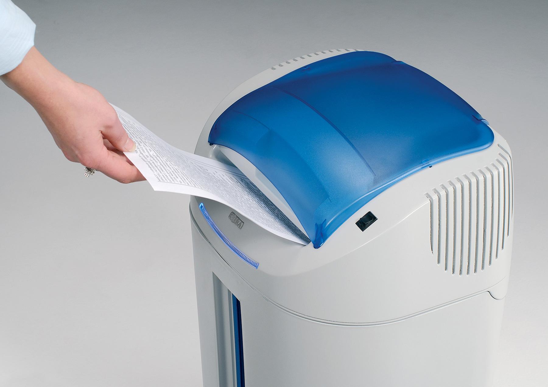 Due gruppi di taglio separati - uno per la carta e l’altro per CD/DVD/carte di credito - separano gli sfridi del materiale distrutto (carta o plastica) in due distinti contenitori integrati da 38,5 e 1,5 litri che non necessitano di sacchetti. Uno speciale dispositivo rileva l'estrazione del cesto e ferma automaticamente il gruppo di taglio (Safety Stop). Il comodo cesto, comodamente estraibile senza sollevare il corpo macchina, ha una finestra anteriore trasparente per il facile controllo del livello di riempimento.