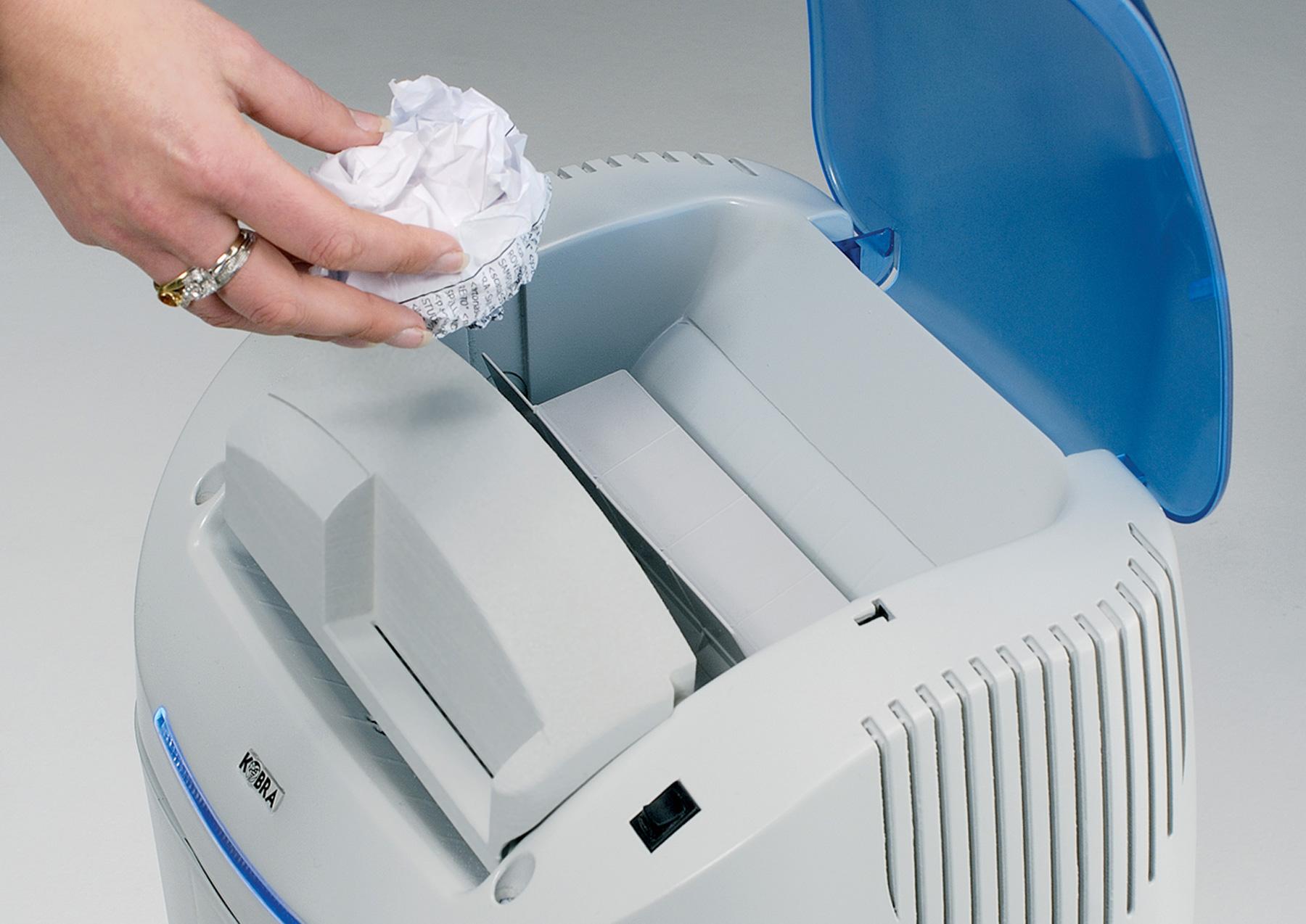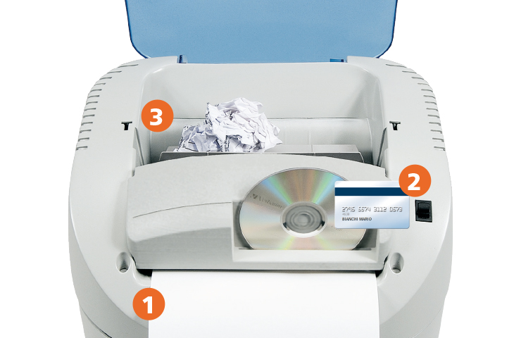 Due gruppi di taglio separati, uno per la carta e l’altro per CD/DVD/carte di credito, separano gli sfridi del materiale distrutto (carta o plastica) in due distinti contenitori integrati da 38,5 e 1,5 litri che non necessitano di sacchetti. Uno speciale dispositivo rileva l'estrazione del cesto e ferma automaticamente il gruppo di taglio (Safety Stop). Il comodo cesto, comodamente estraibile senza sollevare il corpo macchina, ha una finestra anteriore trasparente per il facile controllo del livello di riempimento.