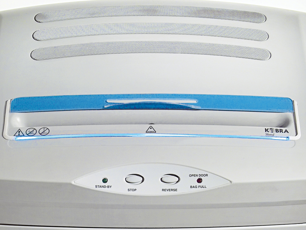 Kobra 380 C2 AO distrugge silenziosamente, grazie alla larga bocca d'entrata, grandi quantità di documenti e carte di credito.