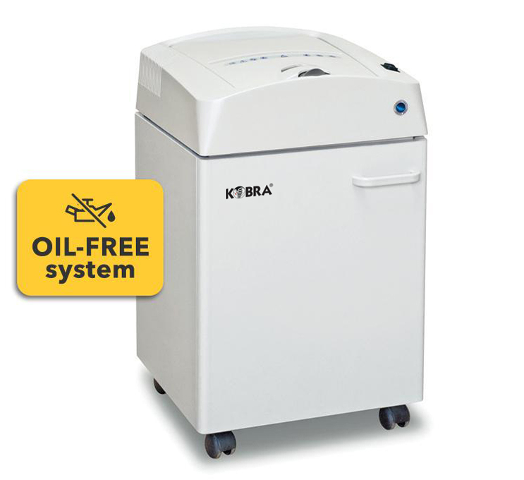 Dotato di esclusiva funzionalità Oil-free, motore a funzionamento continuo e coltelli in acciaio temprato ad alto tenore di carbonio. Il sofisticato Sistema Energy Smart per il risparmio di energia in stand-by mode dopo solo 12 secondi di non utilizzo, permette un notevole risparmio nei costi di gestione della macchina. Kobra AF+1 ha una velocità distruttiva di 13 fogli al minuto e un mobile da 40 litri su ruote girevoli, ideale per uffici di piccole-medie dimensioni.