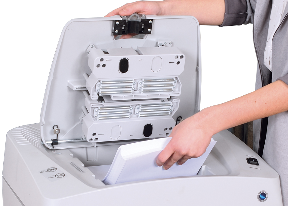 Kobra AF+1 40 litri, con il suo speciale sistema di alimentazione automatica, permette una comoda e veloce distruzione di fogli singoli A4 in frammenti da 3,5 x 40 mm (P-4). Il cassetto per alimentazione automatica da 300 fogli è dotato di una finestrella posta sul coperchio che consente di verificare il completamento della distruzione. Kobra AF+1 40 litri ha inoltre una bocca d’entrata separata per l’inserimento manuale di documenti.