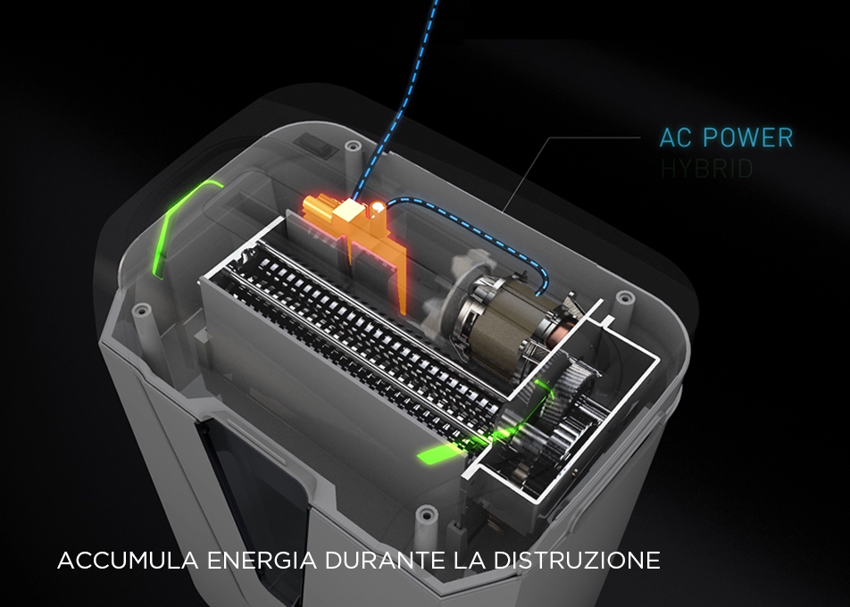 Una meccanica affidabile e durevole con motore a funzionamento continuo e coltelli in acciaio, non danneggiabili da punti metallici e graffette, assicurano prestazioni impareggiabili unitamente a un design e tecnologia LED esclusivi. Cestino da 30 litri con comoda finestra per controllare il livello di riempimento. Eco-compatibile: non richiede l'uso di sacchetti di plastica.