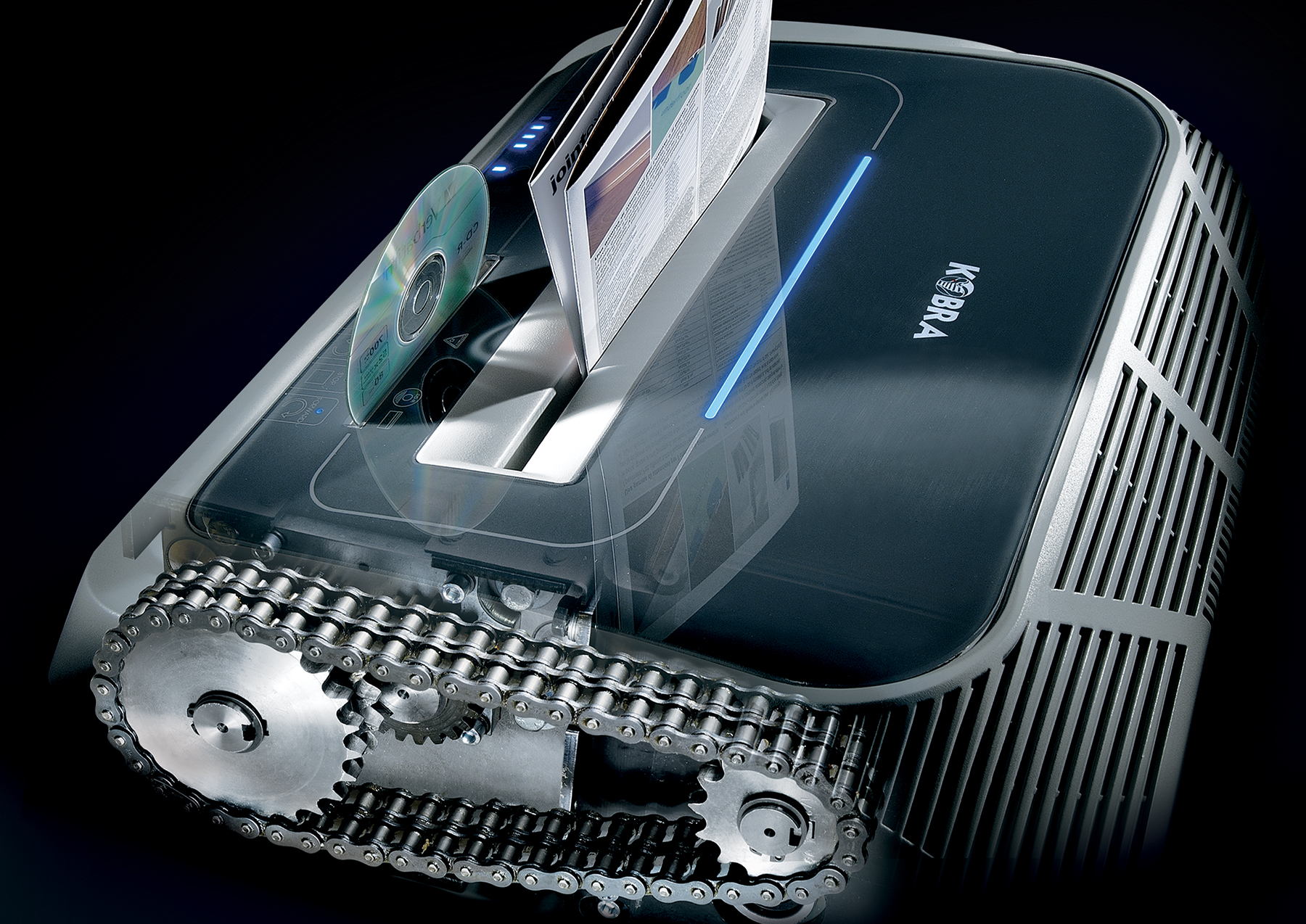 Distruggidocumenti con pannello touch screen: le funzioni della macchina si attivano con il solo sfioramento del comando sul pannello. Dotato di due motori con protezione termica, capaci di funzionare 24 ore su 24 senza surriscaldarsi, KOBRA 310 TS CC4 può distruggere fino a 31 fogli di carta per volta con taglio a frammento da 3,9 x 30 mm (P-4). I coltelli in acciaio temprato ad alto tenore di carbonio, non danneggiabili da graffette e punti metallici, hanno speciali profili che elevano la capacità distruttiva pur mantenendo bassi consumi. Robustezza e resistenza all'usura garantite da ingranaggi in acciaio e trasmissione a catena.